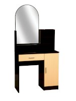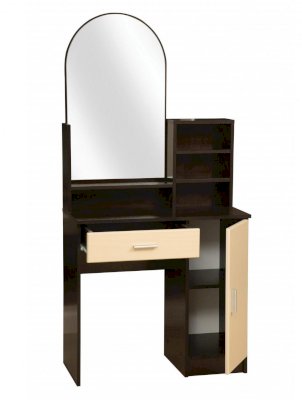 Туалетный стол «Надежда-М09» – эстетичный и функциональный предмет интерьера, создающий для пользователя необходимые условия для поддержания красивого внешнего облика. Зеркало полуовальной формы располагается справа, слева выполнена конструкция с открытыми полками для размещения флаконов с парфюмерией, сувениров, статуэток и т.п. Выдвижной ящик и секция с распашными створками позволяют хранить множество полезных вещей. Свободная ниша слева позволяет удобно располагаться человеку непосредственно перед зеркалом в положении сидя.