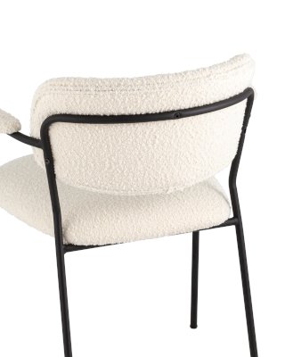 Современный обеденный стул с подлокотниками и металлическими ножками. Обивка выполнена из мягкой и легкой ткани букле. Красивый и очень мягкий материал, который оставляет ощущение теплоты и уюта. Металлический каркас черного цвета огибает спинку и плавно переходит из подлокотников в ножки. Широкое сиденье обеспечивает удобную посадку и уют. На подлокотниках для дополнительного комфорта предусмотрены мягкие накладки.