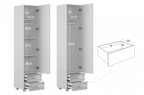 Модуль оснащён одной распашной дверцей и двумя вместительными выкатными ящиками в нижней части, предназначенными для хранения одежды, текстиля или аксессуаров. Внутреннее наполнение можно выбрать в зависимости от потребностей: шкаф может быть укомплектован полками или штангой для плечиков, что делает его удобным для хранения как сложенных вещей, так и одежды на вешалках.
