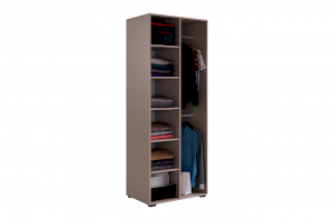 Шкаф оснащён длинными пластиковыми ручками и имеет удобное внутреннее наполнение: слева расположены полки, а справа — две штанги для вешалок. Это позволяет рационально использовать пространство и разместить различные типы одежды.
