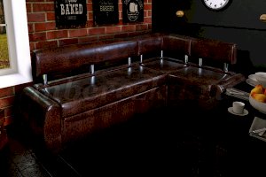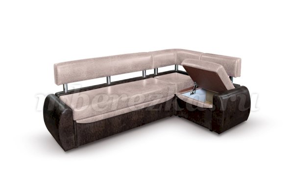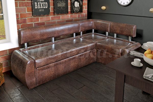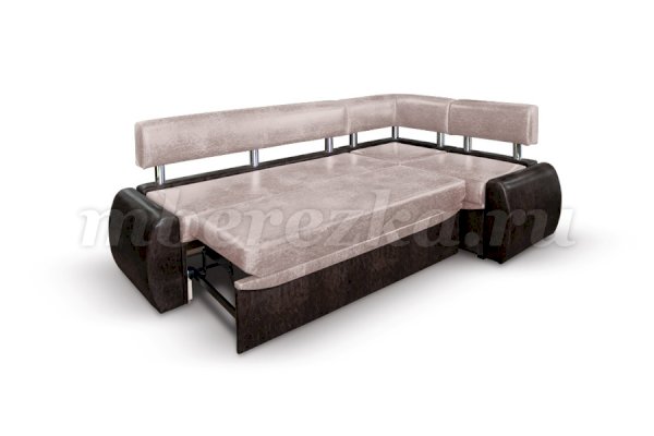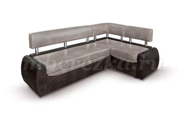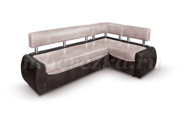 Небольшой раскладной кухонный уголок имеет обтекаемые округлые формы, что актуально для маленьких по площади кухонь. Такая мебель зрительно расширяет пространство, так как в ее дизайне не используются «ограничители» - строгие прямоугольные формы. Мягкость кухонному уголку придает наполнитель пенополиуретан.