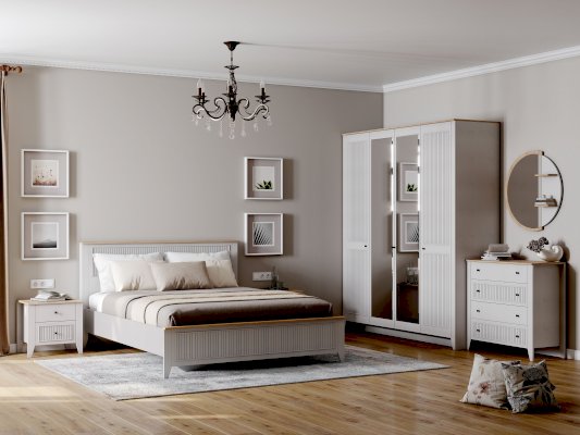 Кровать Валенсия выполнена из ЛДСП в комбинации Дуб натуральный светлый/Персидский жемчуг. УФ-фотопечать полосок на изголовье и изножье в обрамлении пластиковых молдингов придает изделию оригинальный стиль современной классики.