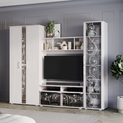 Гостиная "Флоренция" отличается утонченным дизайном и практичностью. Оттенок "белый ясень" в сочетании с растительным принтом придают помещению свежесть и легкость.