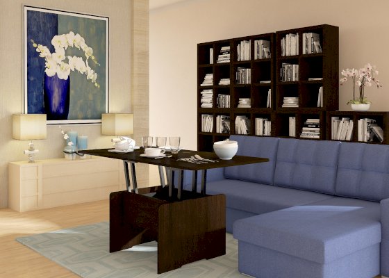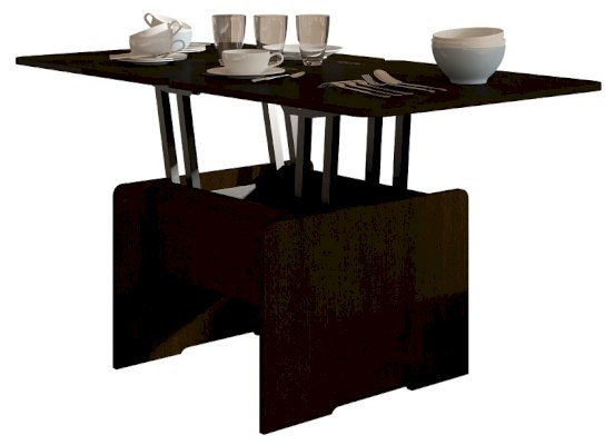 - Функциональность. Купив стол-трансформер потребитель получает сразу два изделия: небольшой журнальный столик и полноценный обеденный стол на 6–8 человек.