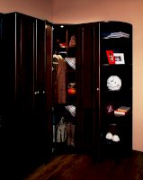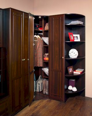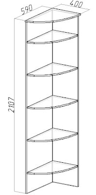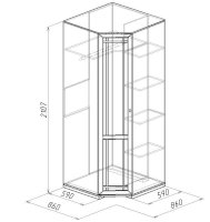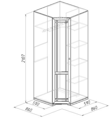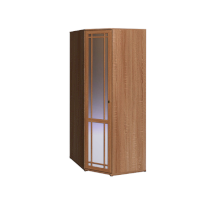 Используйте углы в комнате рационально! Угловой шкаф оснащен стационарной штангой длиной 81 см, полочками для белья и автоматической подсветкой, которая включается, если шкаф открыт. Фасад углового шкафа изготавливается только в исполнении «левый» (определяется по расположению петель). По своим габаритам угловой шкаф подходит для компоновок глубиной 590 мм.