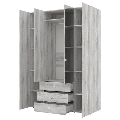 Распашной четырехстворчатый шкаф для одежды и белья Neo — практичная и функциональная система хранения в спальне. Шкаф отличает стильный дизайн, в облицовке использованы материалы трендовых цветов: Дуб Шавиниган и Антрацит. Лаконичные квадратные металлические ручки с гальваническим покрытием придают модели брутальный вид. Гардероб имеет классическое наполнение: два боковых отделения с полками для текстиля, центральное - с выдвижными ящиками на шариковых направляющих и отделением со стационарной штангой для плечиков. Дверцы центральной части шкафа оформлены зеркальным полотном, благодаря чему модель становится визуально легче, а комната выглядит более светлой и просторной.