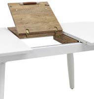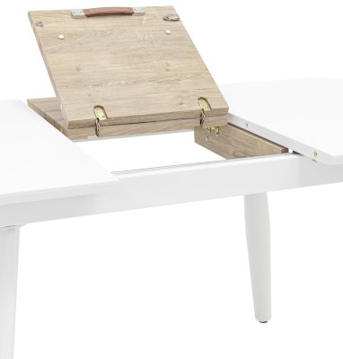 Обеденный стол раскладной. Столешница выполнена из прочного и долговечного МДФ. Светлая глянцевая поверхность столешницы гармонично сочетается с металлическими ножками. Простая прямоугольная форма стола позволит легко вписать его в современный интерьер, стол украсит кухню, гостиную или современное кафе, ресторан. Дополнительная вкладка стола выполнена из МДФ с бумажным шпоном цвета беленого дуба. На вкладке предусмотрена петля для комфортного открытия стола одной рукой.