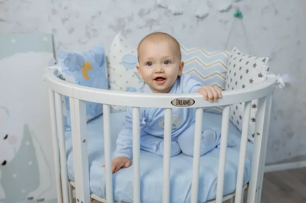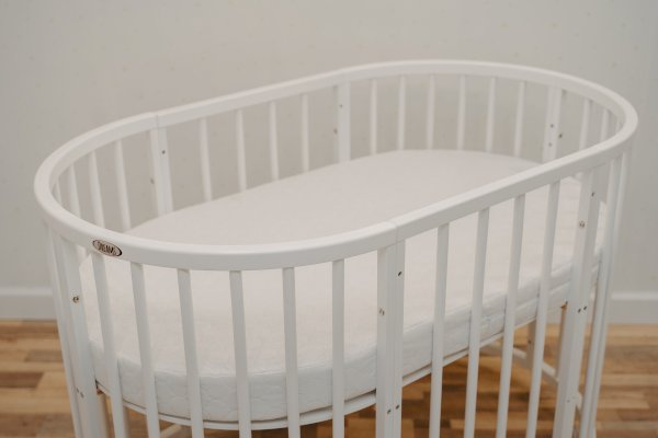 2. Овальная кроватка. Длину кроватки можно корректировать относительно роста ребенка. Это сделает покупку долговечной и избавит от необходимости покупать малышу новую кровать как минимум на пять лет вперед. Размеры овальной кроватки 70*128 см. Для овальной кроватки вы можете приобрести дополнительно овальный матрас.