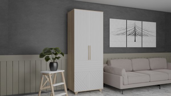 Петли с доводчиком обеспечивают плавность хода при открывании и закрывании, а ручки из массива дуба придают шкафу приятный стиль.
