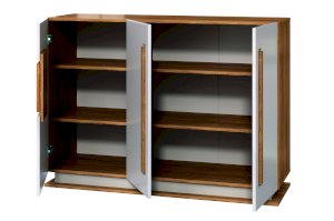 Комод установлен на цоколь, который дополнен площадкой из ЛДСП в цвет корпуса. Этот декоративный прием позволяет создать ощущение целостности композиции модулей при составлении отдельных элементов рядом.