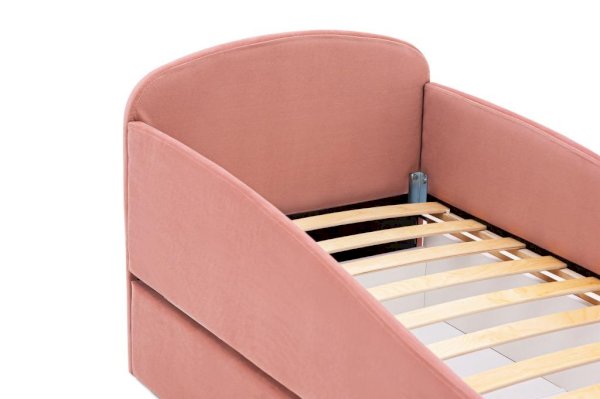 Кровать выполнена в минималистичном скандинавском стиле, который очень популярен сейчас в интерьере. Мягкая обивка придает уют и приятна на ощупь.