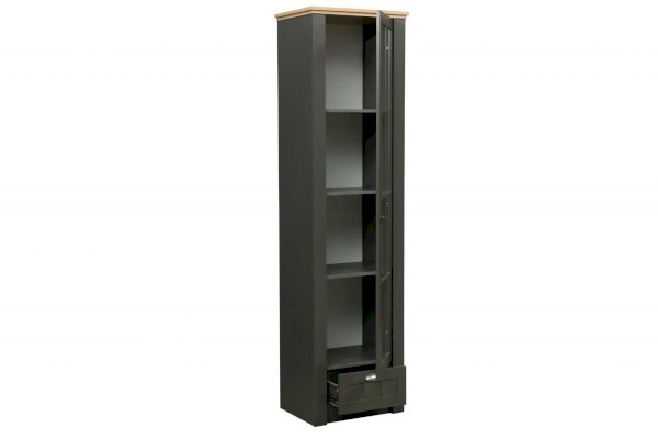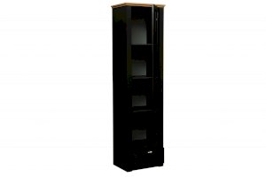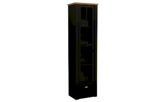 Этот шкаф взял в себя все самое лучшее от модуля 37.05 и 37.04. Витражный фасад, выдвижной ящик – такие же, как в комбинированном шкафу 37.05, а вот по размерам он полностью повторяет пенал 37.04. Таким образом мы получаем стройный, изящный и компактный шкаф-витрину. Комбинированным его называют не зря, так как у него есть и полки, и выдвижной ящик. Он хорошо смотрится как отдельно, так и вместе со своим братом-близнецом – пеналом. Внутри находятся четыре полки из ЛДСП, каждая из которых выдерживает вес до 5 кг. Внизу расположен выдвижной ящик – миниатюрный, но вместительный.